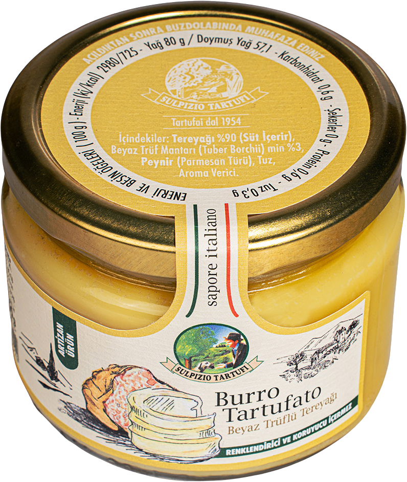 Ингредиенты: сливочное масло 90%, белый трюфель (Tuber Borchii Vitt.) 3%, сыр (Grana Padano), соль, ароматизатор.